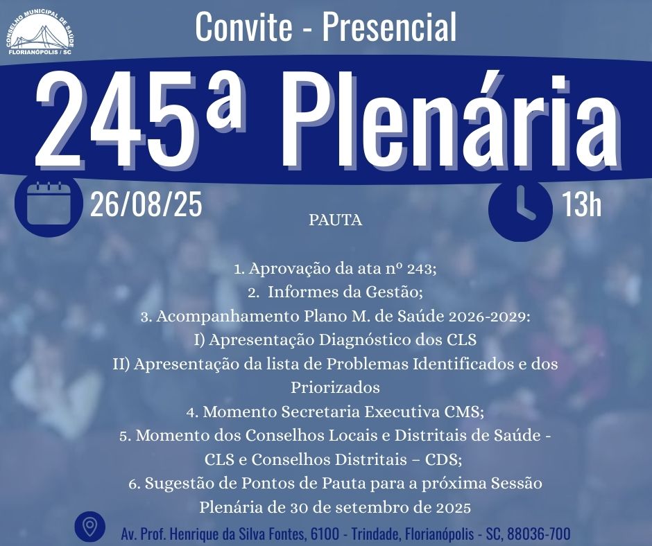 O Presidente do Conselho Municipal de Saúde de Florianópolis – CMS, no uso de suas atribuições legais e regimentais, convoca os Conselheiros Municipais de Saúde para participarem da 245ª Reunião Ordinária PRESENCIAL a realizar-se na terça-feira, 26 de agosto de 2025, às 13h, no Auditório da Secretaria Municipal de Saúde, av. Prof. Henrique da Silva Fontes nº 6100, Trindade. |